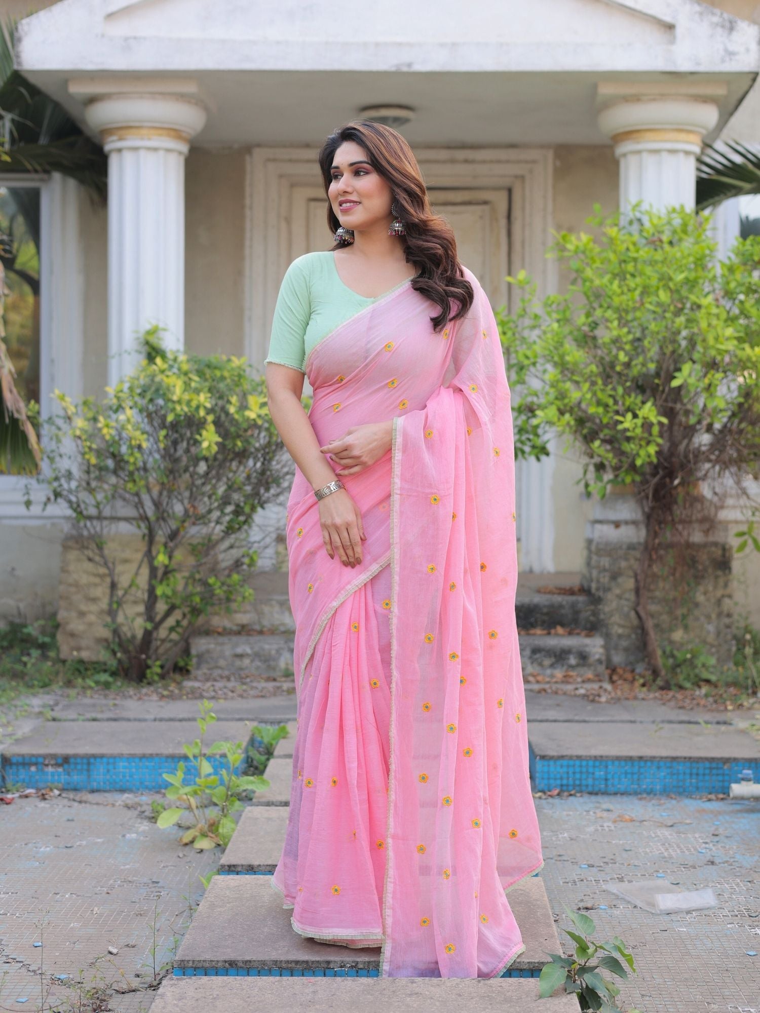 ABOUT THE SAREEPretty in pink, a soft mul cotton saree with all over embroidered small flowers. comes with a contrast ruffle lace and blouse pc.