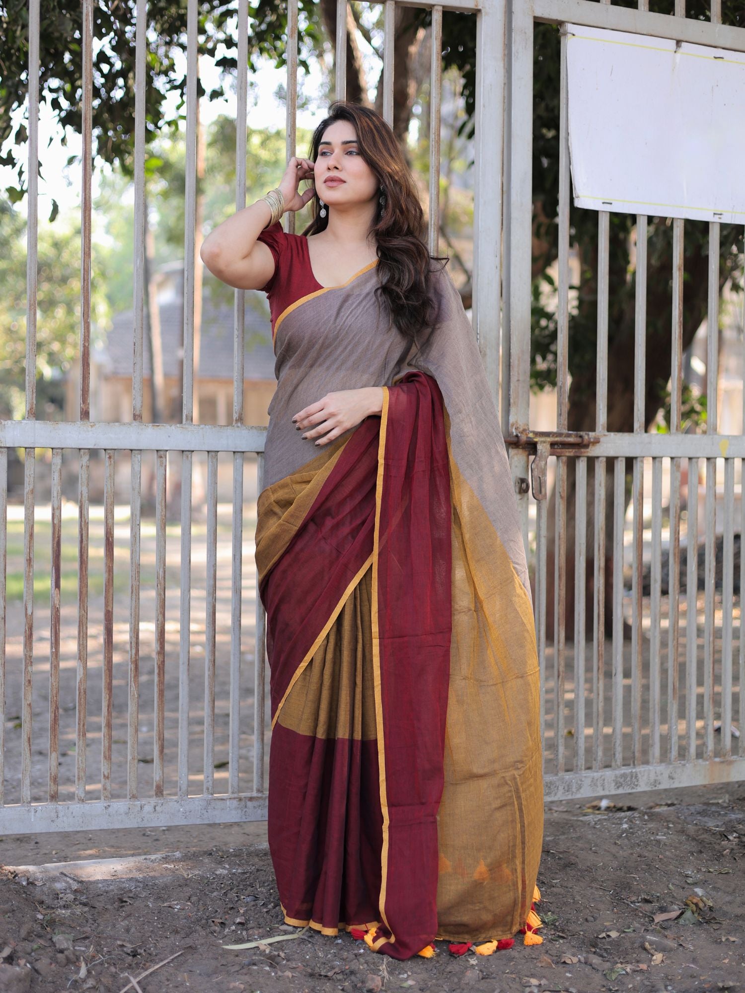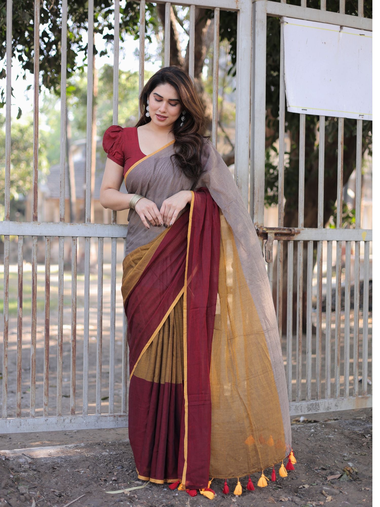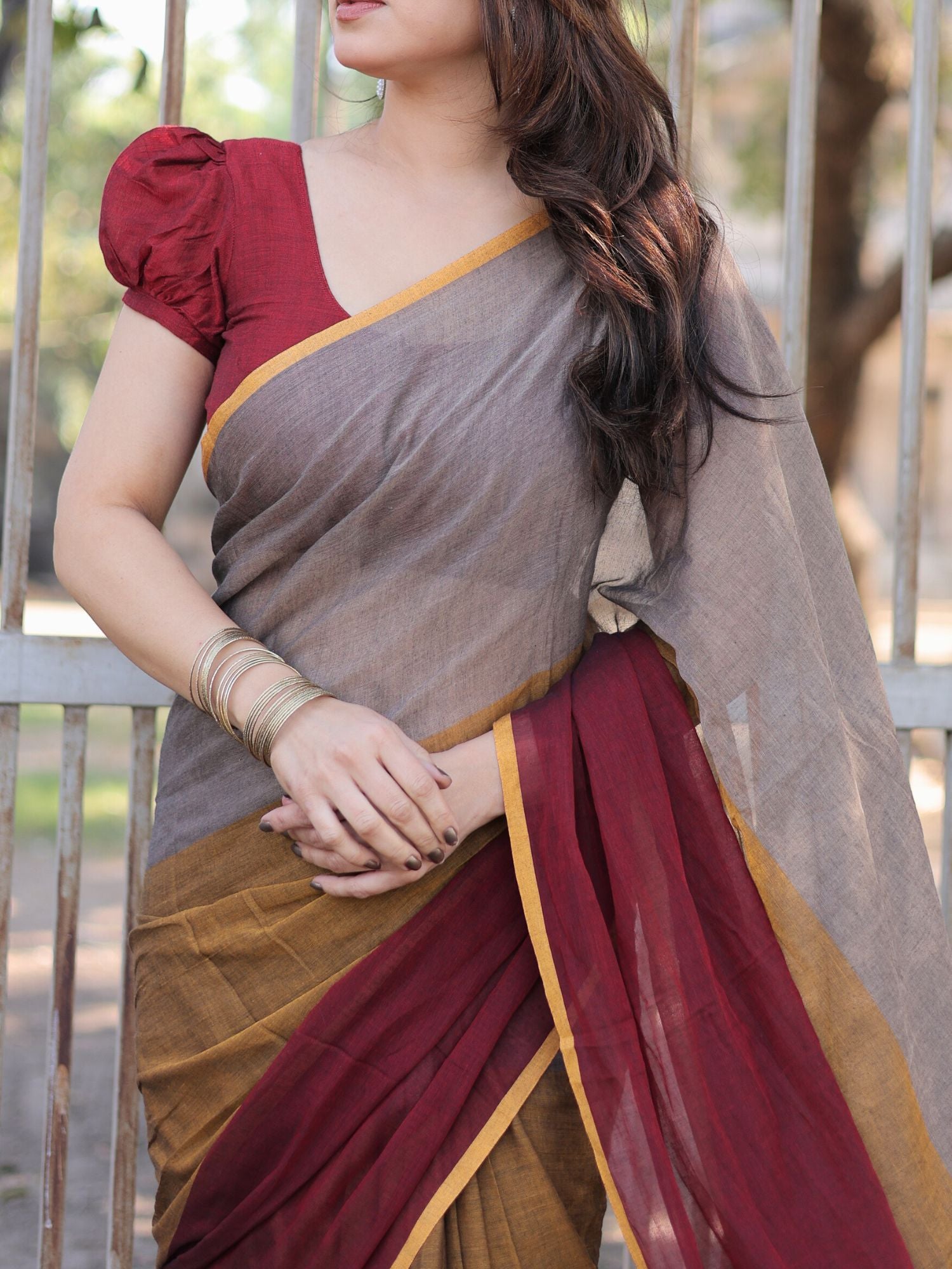 ABOUT THE SAREEWarm marron touched by sunlight, our idea behind creating this color combination, beautiful, subtle and so soft!
